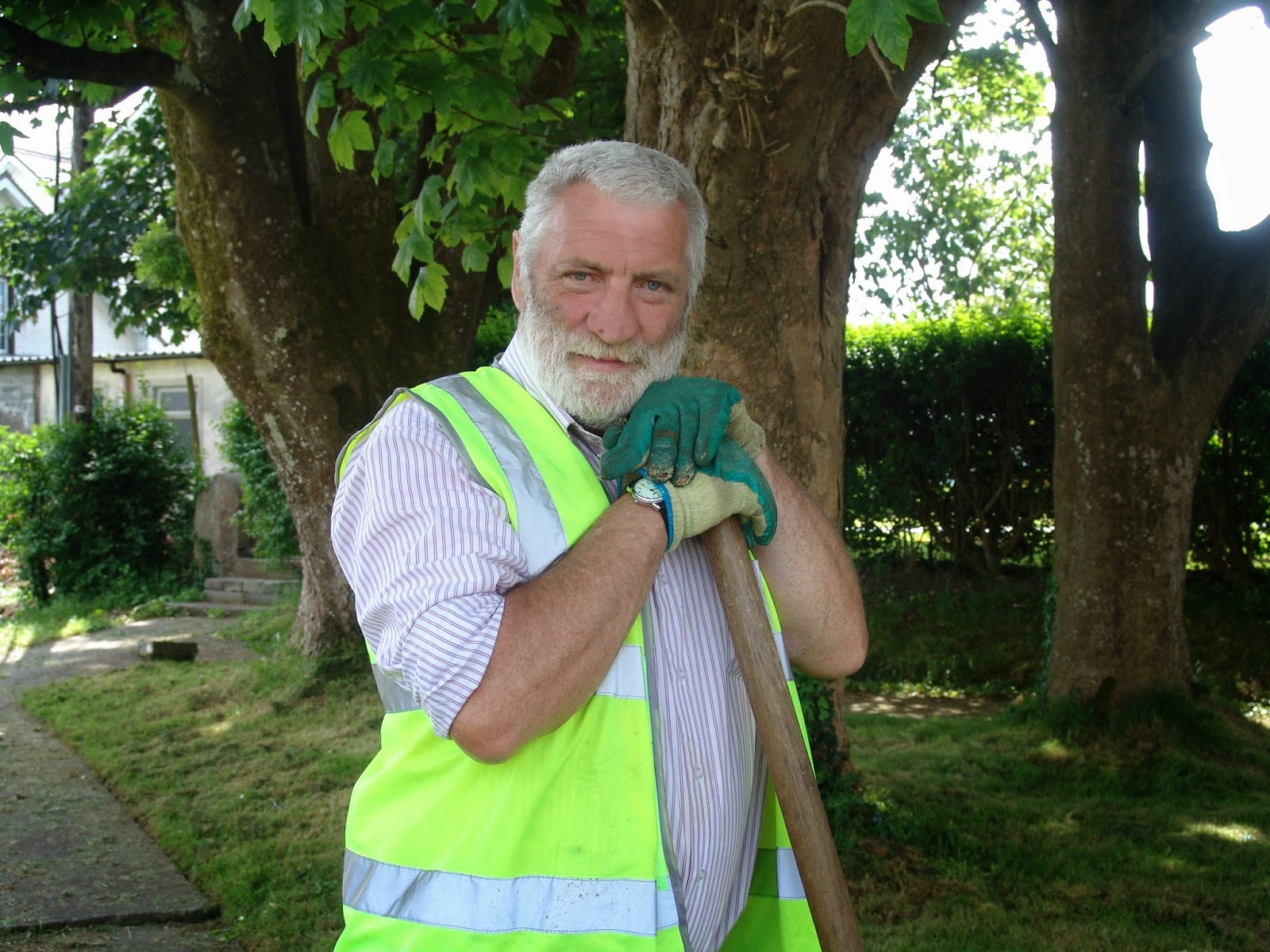 in yellow florescent vests you see mowing the grass at the cemetery or raking